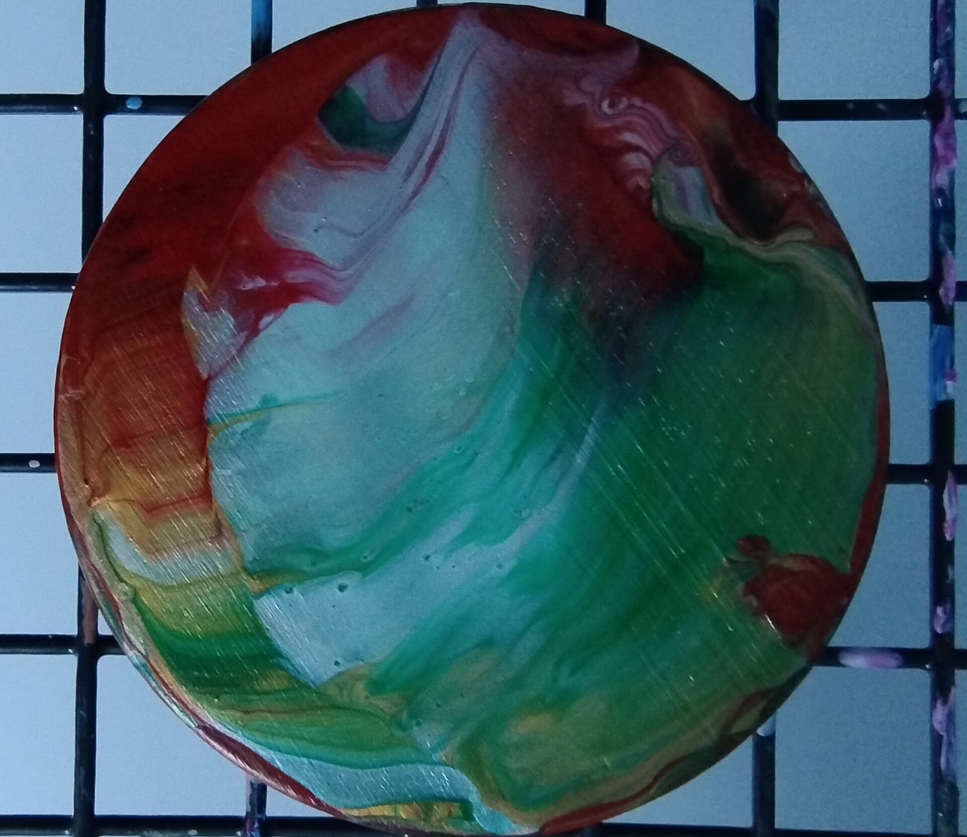 De acrylverf wordt gemengd met een gietmedium zodat ze goed kan vloeien. Daarna worden verschillende kleuren op de onderzetter gegoten en voorzichtig verspreid door te kantelen of eenvoudige hulpmiddelen te gebruiken. Zo ontstaan unieke patronen en kleurcombinaties.